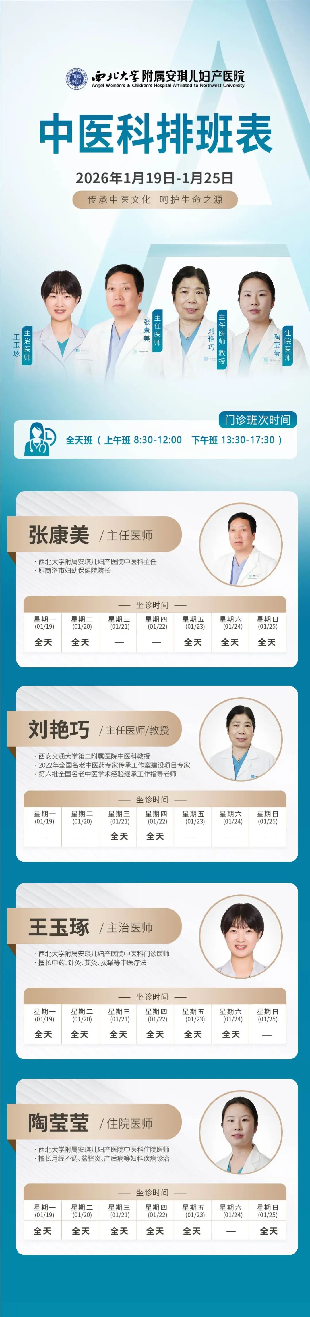 西安安琪儿妇产医院(1月19日至1月25日)专家坐诊时间表