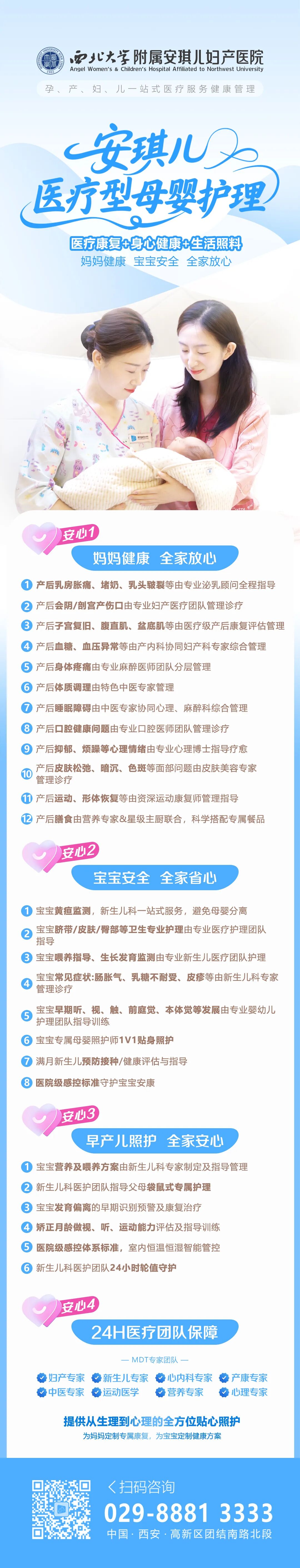 安琪儿母婴护理中心集妇产科、新生儿科、乳腺门诊、中医科、心理门诊、内科、产后康复门诊、儿童保健科、营养门诊等资深医护团队于一体,为产后女性和新生儿提供产后调养康复、营养膳食、新生儿照护、育儿指导、宝宝早教智力开发、健康心理疏导等“一站式”医疗级产后母婴照护服务,帮助新手妈妈和宝宝科学、安全地度过产褥期和新生儿期。